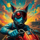 Prompt: A European tricolor cat meticulously grooming itself while perched on a weathered stone bench, its fur—distinct patches of orange, black, and white—catching the soft autumn light. Behind it, a cluster of vibrant blue hydrangeas blooms flamboyantly against crumbling stonework, their intense color contrasting with the bench's muted grey. The landscape framing captures a cobblestone path strewn with fallen leaves in warm ochres, burnt siennas, and deep russets, evoking Renoir's autumnal palette. Gentle dappled sunlight filters through unseen trees, casting soft shadows that enhance the scene's tranquil, painterly quality.
