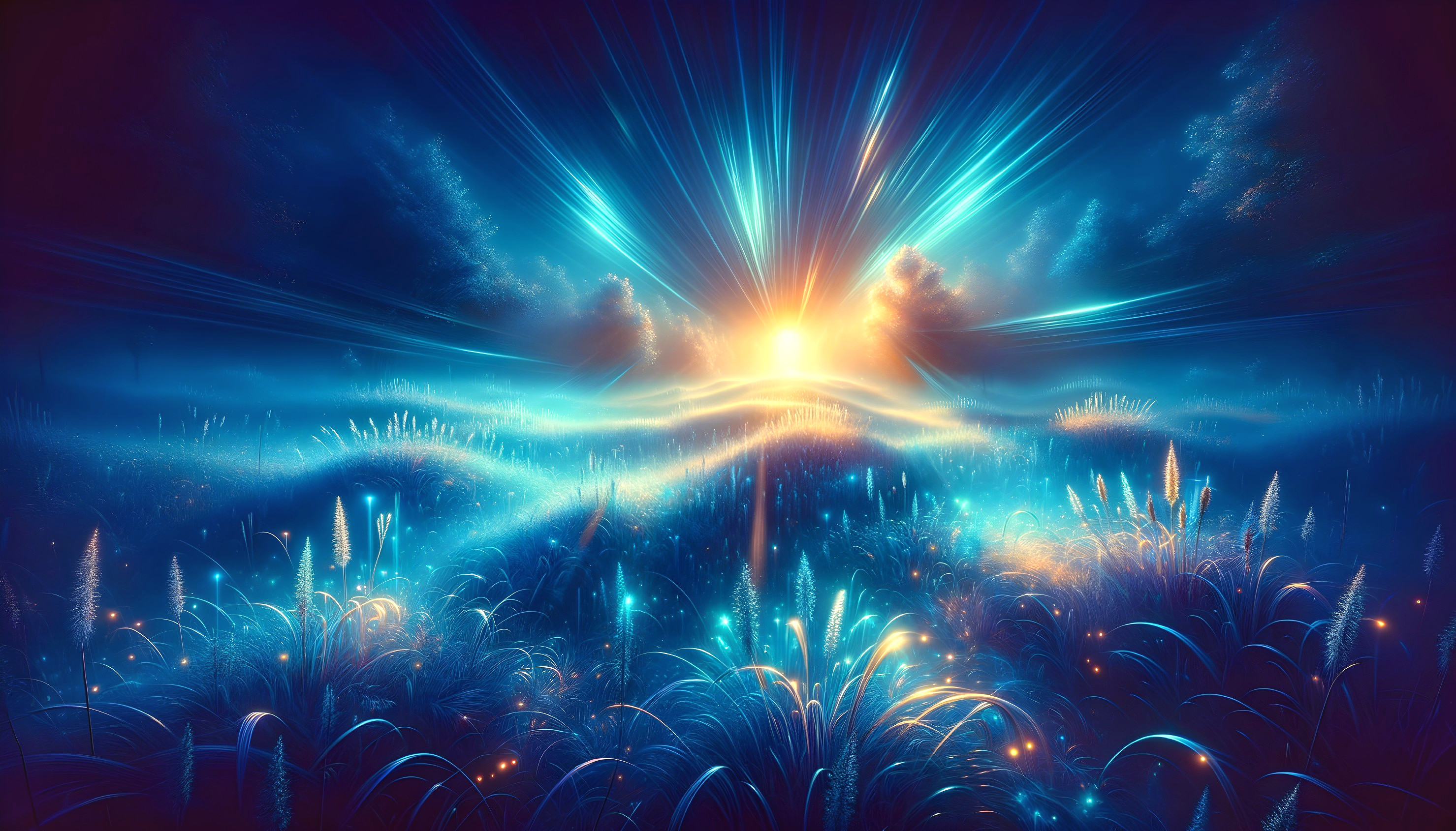 • Prompt: They stumbled into the meadow, somewhat disoriented in the early morning light. An electric blue shone over the grasses in the field, and it was a moment outside of time. Style: Alex Alemany, Jessica Rossier, Tim White, masterpiece, bright vivid colors, atmospheric, otherworldly, dramatic, 64K, UHD, Trending on Artstation, 3D volume, 3D shading, trippy, acid influence, light reflections, dreamy, magical realism, vibrancy, motion