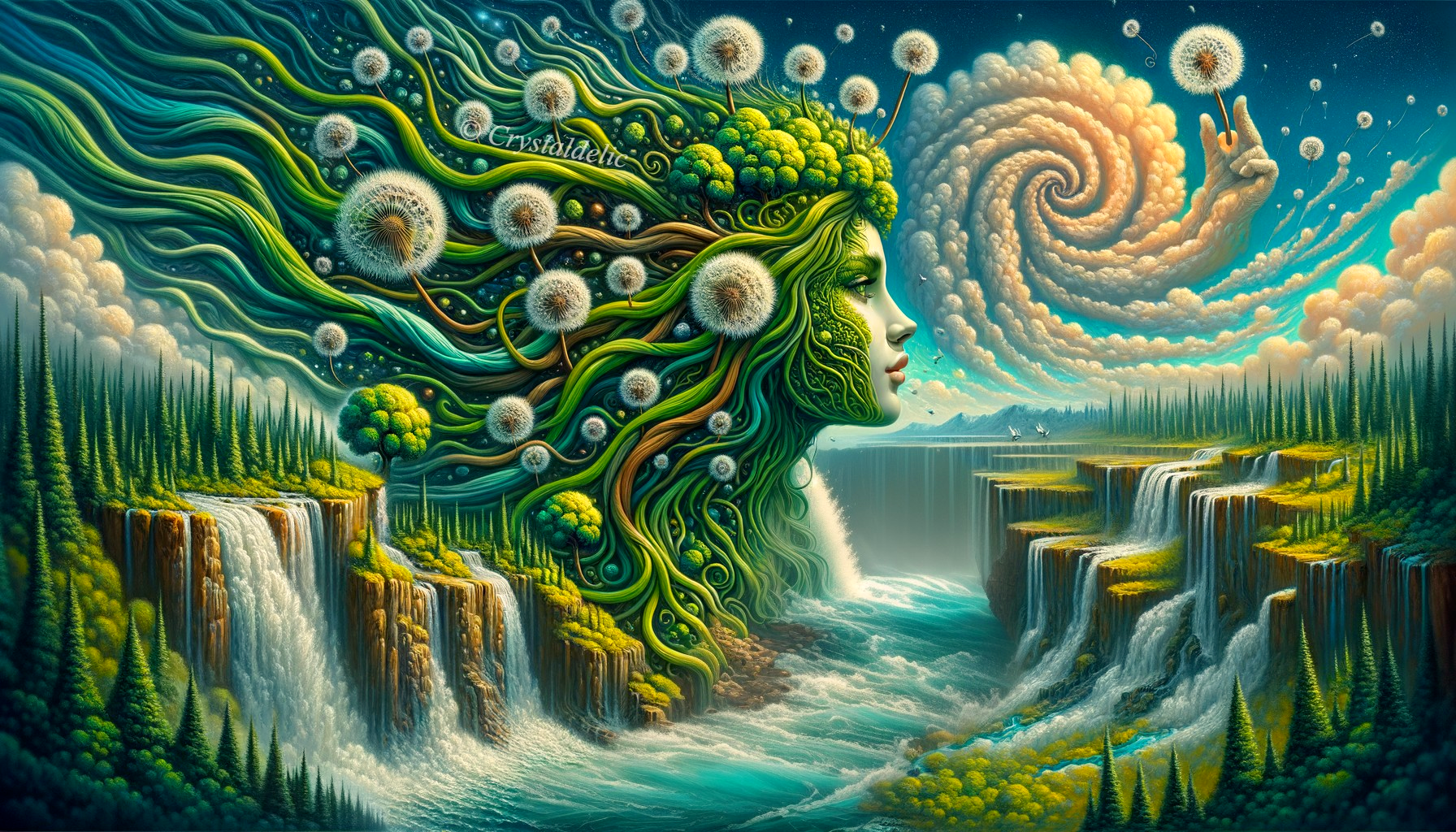 • Prompt: Surrealism. The goddess of spring in Slavic mythology is Vesna. Her head emerges above shimmering turquoise waters, her flowing strands of hair stretching like green branches of a dense forest, intertwined with grapevines. Her hair forms a dense forest ecosystem with waterfalls cascading into the winding river below. Surrounding the face, a panoramic view reveals a green valley with towering cliffs. Majestic landscape with a dynamic, spiral cloud formation. Floating in the air are numerous dandelion puff balls, adding dynamism, magic, and a sense of freedom. 1 point perspective. Mysterious, intricate motifs, perfect composition, masterpiece insanely-detailed ultra-detailed extreme-detailed hyper-detailed beautiful, graffiti art, splash art, street art, spray paint, oil gouache melting, acrylic, high contrast, colourful polychromatic, ultra detailed, ultra quality, CGSociety.