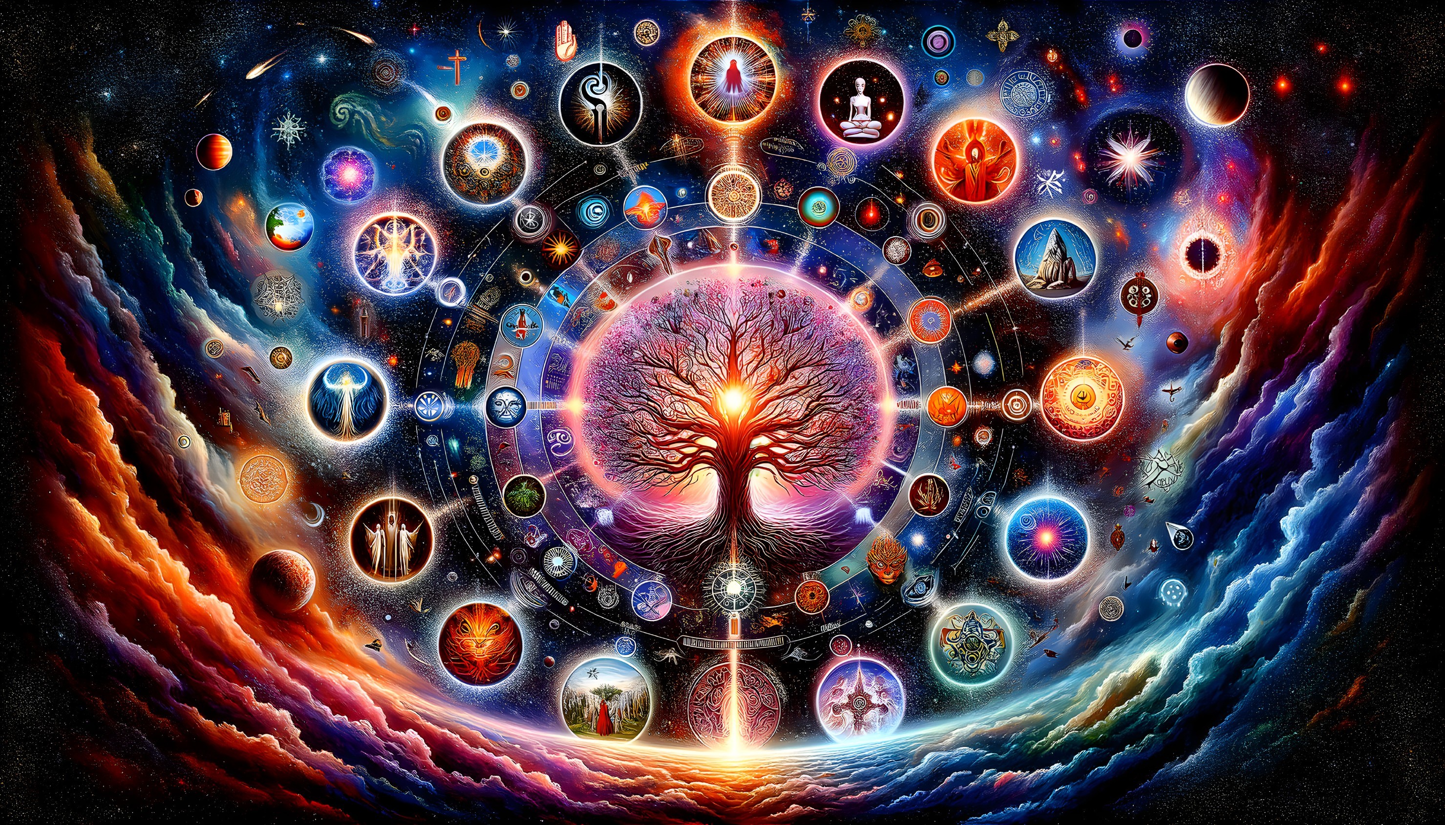 • Prompt: A wide-format, artistic representation that combines all religious and spiritual geneses from around the world into a single, cohesive image. This piece visually narrates the story of creation and enlightenment as seen through the lens of various beliefs, both religious and spiritual. Central to the composition is a cosmic tree, symbolizing life and the interconnectedness of all things. Radiating from the tree are symbols and scenes from major and minor religions, as well as spiritual practices, including but not limited to Christianity, Islam, Hinduism, Buddhism, Judaism, Taoism, indigenous spiritualities, and New Age philosophies. The image is designed with a sense of unity and diversity, blending these elements against a backdrop that suggests a universe filled with stars, nebulas, and light, symbolizing the infinite possibilities of belief and understanding. The goal is to create a respectful, detailed, and high-quality representation that celebrates the many paths to the divine and enlightenment.