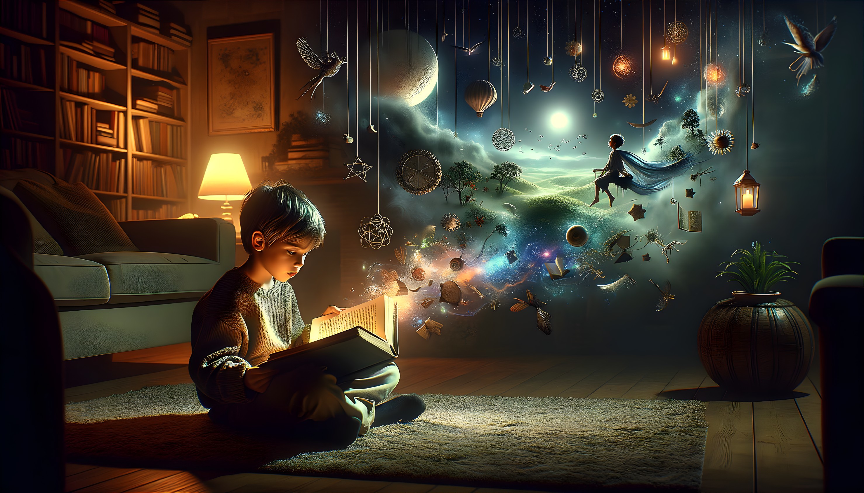• Prompt: Create a 16:9 format digital painting in Full HD resolution featuring a young boy sitting on the living room floor, reading a large open storybook. As he reads, his imagination comes to life, transforming the room into a spiritual realm that extends from the pages of the book. This serene and mystical world should be depicted with elements such as floating ethereal landscapes, celestial bodies, gentle creatures of light, and spiritual symbols that evoke a sense of peace and enlightenment. The boy is immersed in his reading, his expression one of calm wonder and inner reflection. The atmosphere should be tranquil and filled with a soft, otherworldly glow that blurs the lines between his reality and the spiritual journey he is envisioning.
