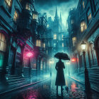 Prompt: A picturesque night scene capturing a historic street in Gdańsk, Poland. The image features cobblestone streets reflecting the glow of warm lights. Framing the image are narrow, colorful buildings with vibrant facades, showcasing a mix of architecture. At the end of the street, a majestic brick building with multiple spires and intricate detailing is illuminated, serving as a stunning backdrop.