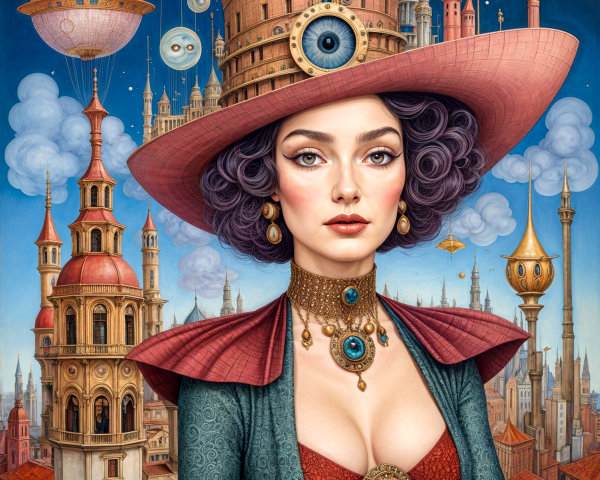 She wears a flowing, dark-colored robe adorned with intricate patterns of circular shapes in rich hues of blue, red, and gold, reflecting an artistic style reminiscent of Gustav Klimt. The robe's design is elegant, featuring a deep neckline that adds a touch of sophistication.