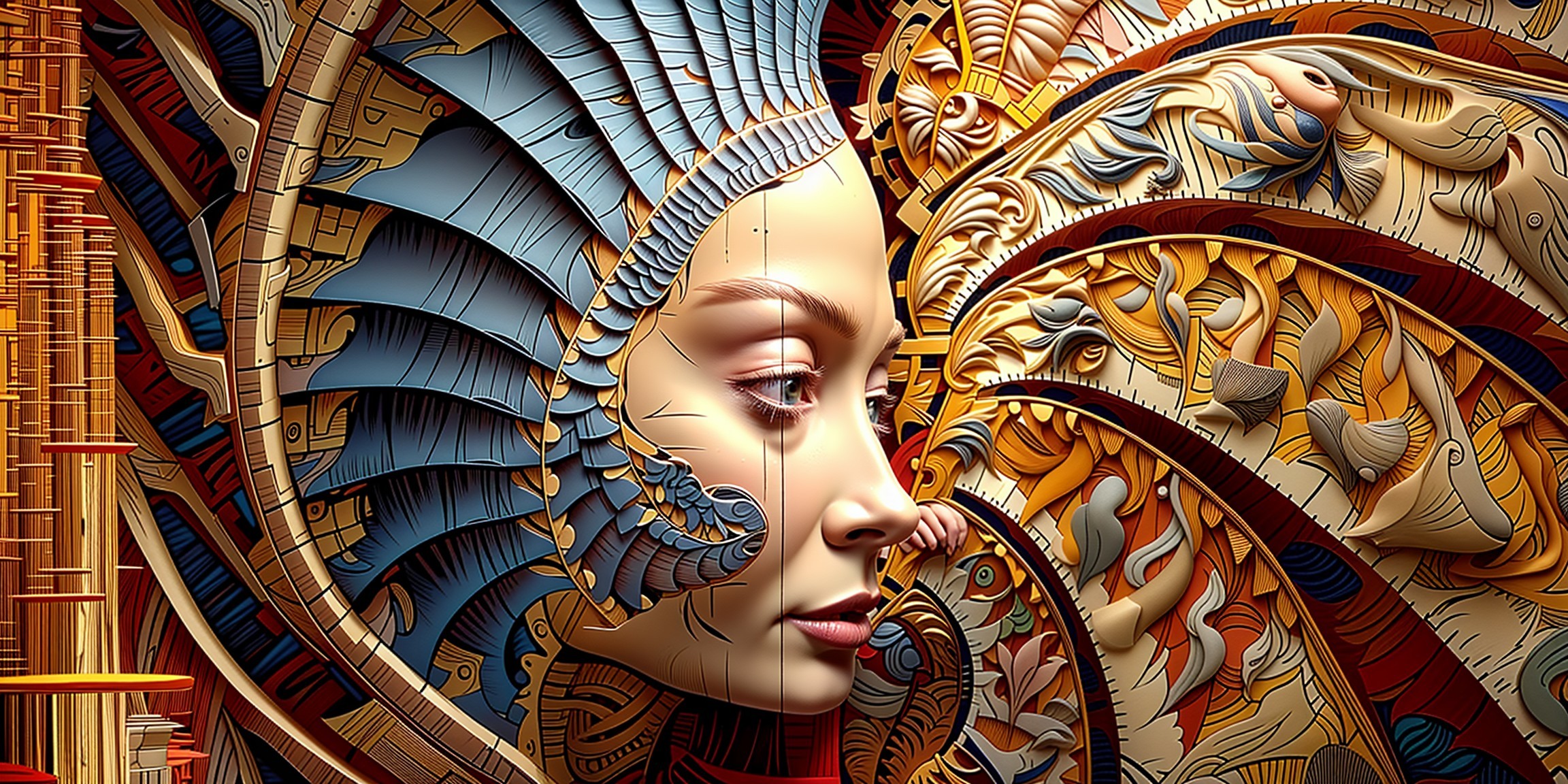 Prompt: A close-up of Jesus Christ face composed of metallic plates including bronze, gold, graphite, and silver that define the shape of the face giving the appearance of a mask. Each element reflecting light in a mesmerizing dance of colors and textures. His metallic hair and beard sway gently in an ethereal breeze against a dark, moody backdrop that contrasts sharply, highlighting her otherworldly beauty. The scene is rendered with exquisite detail, featuring lifelike textures, subtle color gradations, and atmospheric lighting, evoking a blend of Simon Stalenhag's futuristic realism, Zdzisław Beksiński's dark surrealism, and Kinuko Y. Craft's mystical symbolism. Warm hues accentuate the soft glow emanating from the metals, casting an enchanting ambiance across the image.
