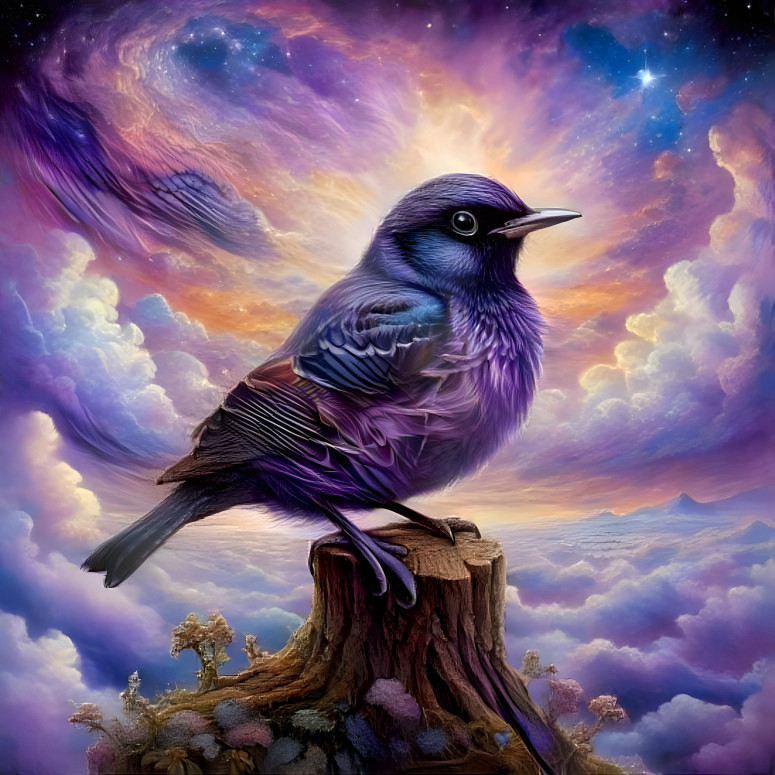 In the middle ground, a solitary tree with dark, almost charcoal-like bark stands tall, its branches streaked with hints of bluish and purplish wax, while its leaves shimmer as if dusted with golden powder. The wind pulls them toward the horizon, leaving behind swirling patterns of movement.