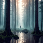 Prompt: Photorealistic digital painting, close-up of a weathered fisherman carrying a mermaid in his arms through a forest. The fisherman has a bald head with a topknot, scowling expression, ruddy complexion, wearing a coarse brown coat and striped leggings tucked into worn leather boots. The mermaid has pink flowing hair, pale skin, scaled tail with iridescent shimmer. Soft diffuse light filtering through the trees, painting dappled shadows on the ground. Atmospheric perspective, shallow depth of field, emphasizing textures: rough bark, worn leather, shimmering scales, soft hair. Environmental context: sparse forest with distant rolling hills and subtle sea view. Cinematic color grading, warm tones, naturalistic. Camera angle: slightly low, capturing the height difference. Medium shot, focusing on the characters and immediate surroundings. Technical precision: High resolution, hyperrealistic detail.