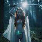 Prompt: Full shot of a medieval fantasy warrior woman with long red hair wearing a full-body white lace undersuit and a flowing white sheer long robe against a deep evergreen forest. The composition is vertically oriented, centered, and viewed from a slightly low angle. She holds a glistening longsword above her head, one arm fully extended, the other outstretched to her side. A strong rimlight from behind illuminates her, creating a backglow and highlighting hair and clothing textures. The forest is cast in deep shadow, creating dramatic contrast. The robe billows around her legs. Dramatic lighting creates a lens flare on the blade. Soft focus, luminous ethereal quality; photographic style; color palette of light blues, greens, and whites contrasted with dark blacks and grays. Mood is mysterious and powerful; atmosphere feels magical. High resolution, sharp focus, intricate details. Cinematic film still, shot on v-raptor XL, film grain, vignette, color graded, post-processed, cinematic lighting, 35mm film, live-action, best quality, atmospheric, masterpiece, epic, stunning, dramatic.