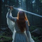 Prompt: A full shot depicting a medieval fantasy warrior woman with long red hair wearing a full-body white lace undersuit covered in a flowing white sheer long robe against a deep evergreen forest. The composition is vertically oriented, with the woman positioned in the center of the frame, viewed from a slightly low angle. She holds a glistening longsword above her head with one arm fully extended, while the other arm is outstretched to her side. A strong rimlight illuminates her from behind, creating a backglow and highlighting the textures of her hair and clothing. The surrounding forest is cast in deep shadow, creating a dramatic contrast. The robe billows around her legs. The lighting is dramatic, creating a lens flare on the blade. Use of a soft focus, rendering with a luminous ethereal quality; photographic style; a color palette consisting of light blues, greens, and whites contrasted with dark blacks and grays. Mood is mysterious and powerful, and the atmosphere feels magical. High resolution, sharp focus, intricate details. [Cinematic film still, shot on v-raptor XL, film grain, vignette, color graded, post-processed, cinematic lighting, 35mm film, live-action, best quality, atmospheric, a masterpiece, epic, stunning, dramatic]