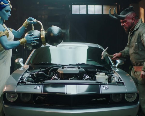 Prompt: A surreal scene featuring a humanoid figure composed of intricate mechanical and organic elements, with flowing hair resembling vines and flowers. The figure is extending a red mushroom with white spots towards a young boy, whose wide eyes are filled with curiosity. The background is dark and textured, enhancing the contrast with the bright red apple. The overall atmosphere conveys a mix of wonder and a hint of mystery, blending themes of nature and technology.