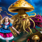 Prompt: Surreal Mexican landscape at night, enchanted atmosphere, diverse cacti species, eight armed, transparent, glowing from within jaguarundi, golden topped mushrooms rise into the sky like space ships on many levels of fractal iterations, desert toads wearing richly embroided cloaks surround the jaguarundi that is in the centre of the view, Vibrant paper illustrations, detailed paper scenes, colorful paper objects, paper art, creative storytelling through paper, dynamic paper compositions, unique paper style, lively and imaginative designs, vibrant color palette, intricate details, 3D paper art, crafty and textured visuals