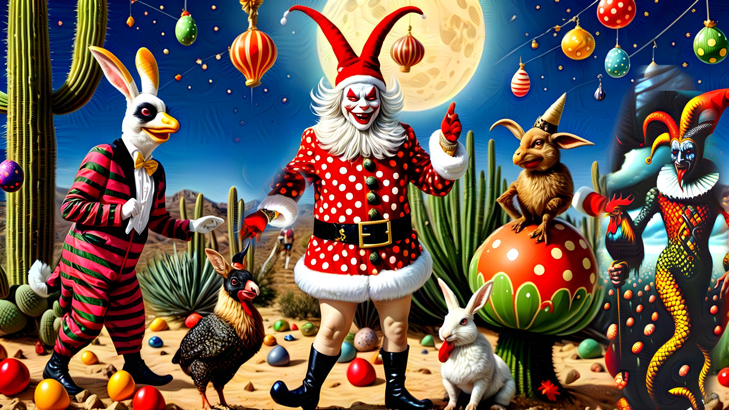 Prompt: A skeletal figure in a dark cloak rides a skeletal dinosaur decorated with skulls, wielding a spear. Surrounding them are other skeletons and demonic figures, set against a surreal, colorful background.