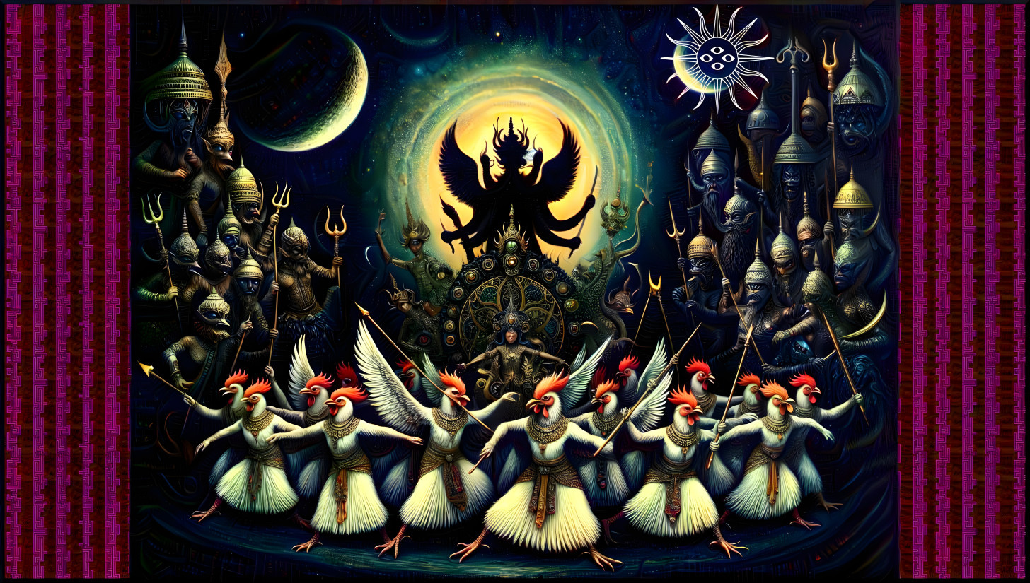 Prompt: "The Sleepwalkers": "At night, this mindless army of rooster headed abraxas, ranks unbroken by dissent, Is moved into action and their pace does not relent. In step, with great precision, these dancers of the night Advance against the darkness of kali the destroyer - how implacable their might!" - ultra high quality, focused, sharp focus, extremely detailed, high definition, intricate, fantasy, colorful, fantastic view