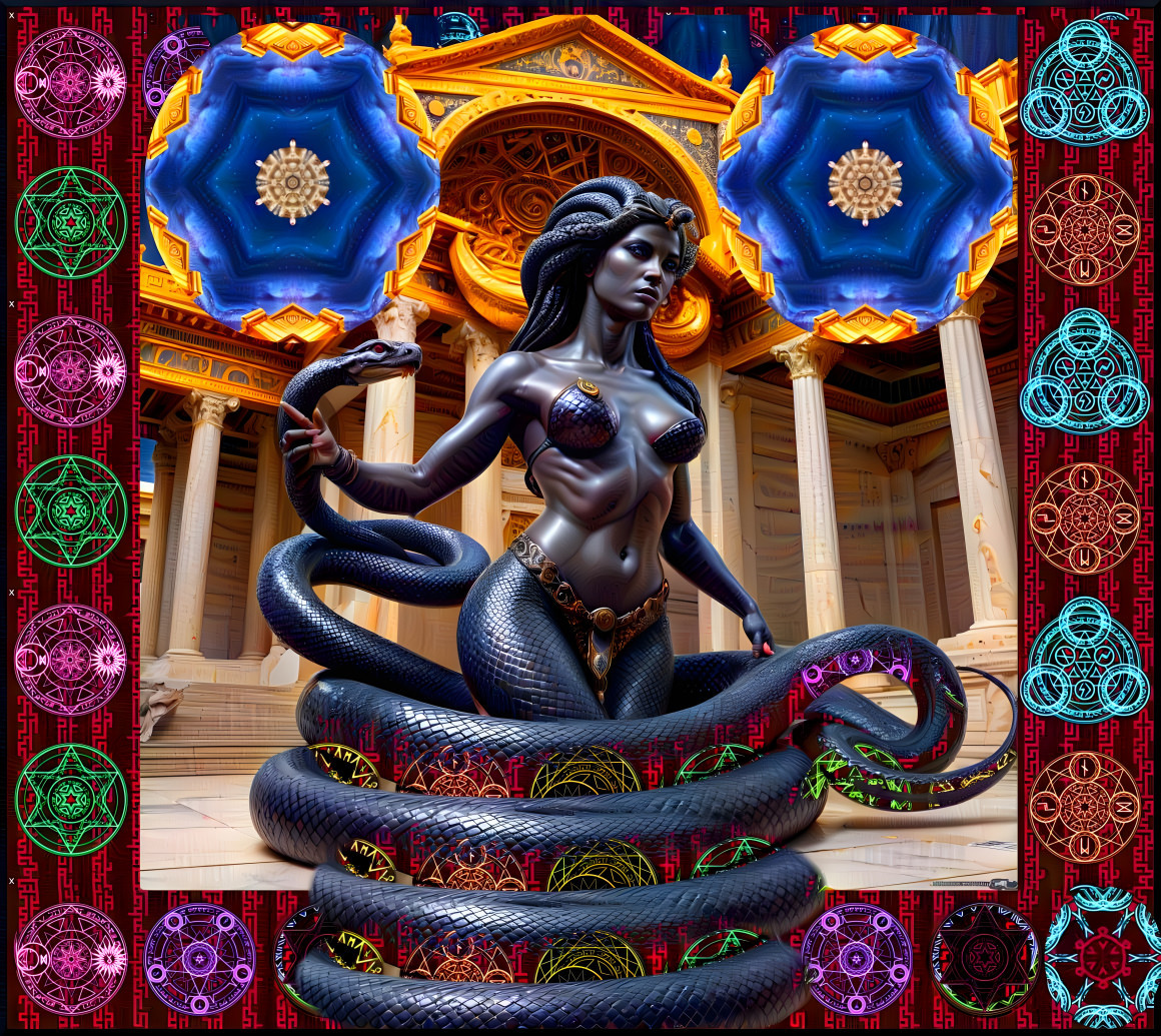 • Prompt: A Lucifer snake slithering before a crumbling female titan carved from forgotten constellations, as the sky fractures into myth and memory. In the 'Mythoclysm' art style—where ancient myth meets apocalyptic surrealism—depict a world unraveling through divine catastrophe. Blend shattered classical motifs with chaotic divine energy, twisted relics of gods, sacred beasts decaying into cosmic ash, and relic temples bleeding molten starlight. Use contrasting textures—cracked marble, burning sky-veins, glitched halos—to create a surreal, sacred collapse