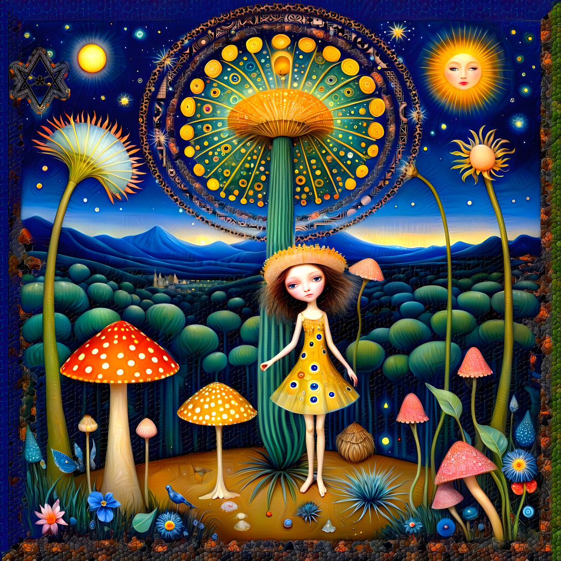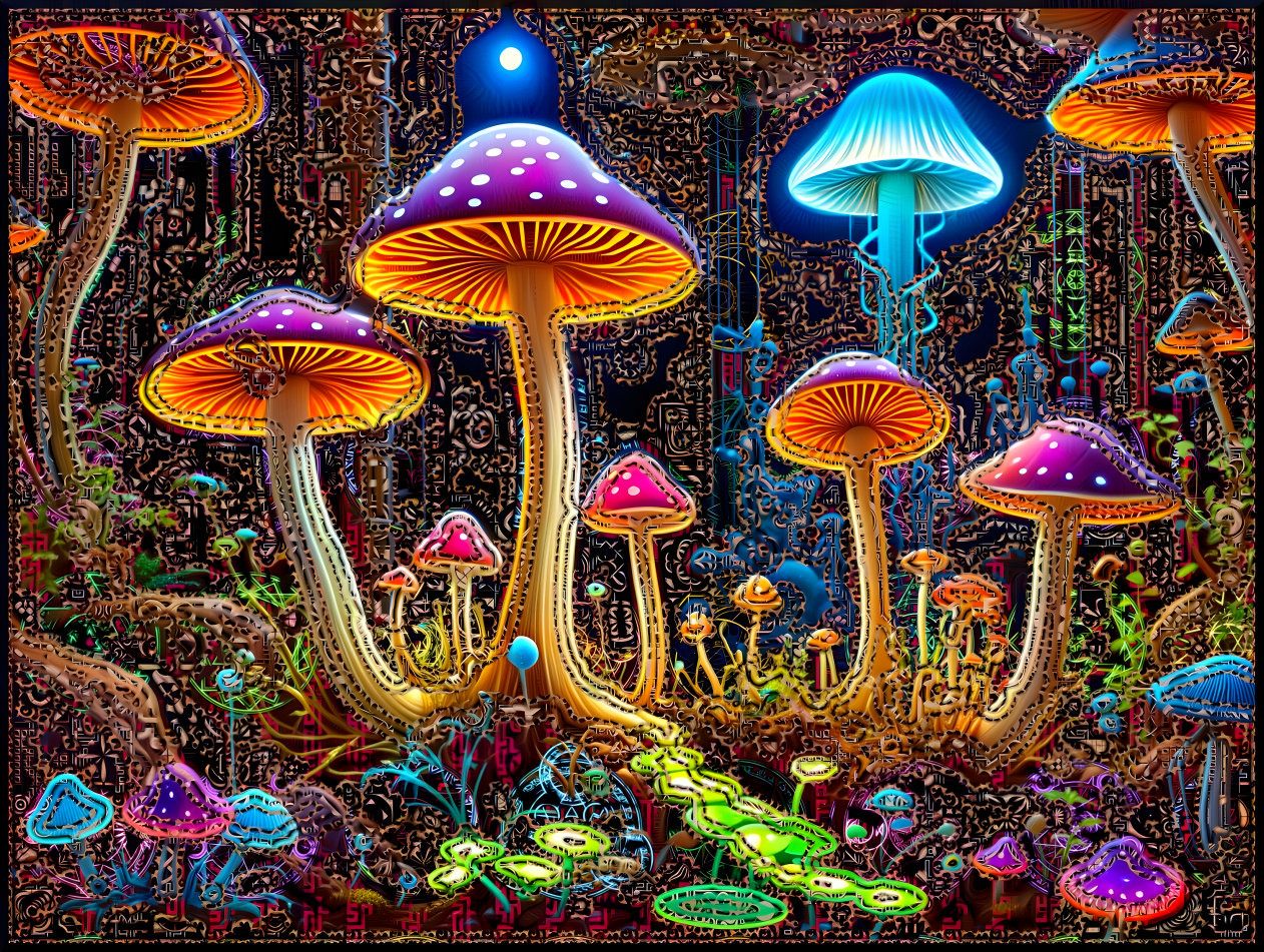 • Prompt: plasma dynamic torus of infinite energy with a vortex going downwards from the sky, mushrooms and cactus everywhere