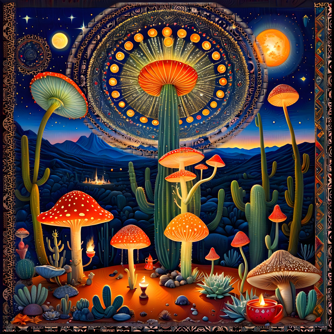 • Prompt: Surreal Mexican landscape at night, enchanted atmosphere, diverse cacti species, eight armed, transparent, glowing from magical energies a wizard sits on a glowing red mushroom in contemplation with a steamy hot cup of tea, golden topped mushrooms rise into the sky like diamond encrusted space ships on many levels of compexity, desert toads wearing richly embroided cloaks surround the jaguarundi that is in the centre of the view, Vibrant paper illustrations, detailed paper scenes, colorful paper objects, paper art, creative storytelling through paper, dynamic paper compositions, unique paper style, lively and imaginative designs, vibrant color palette, intricate details, 3D paper art, crafty and textured visuals