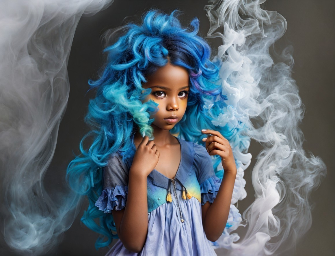 Vibrant blue-haired girl in swirling white smoke, wearing ruffled dress