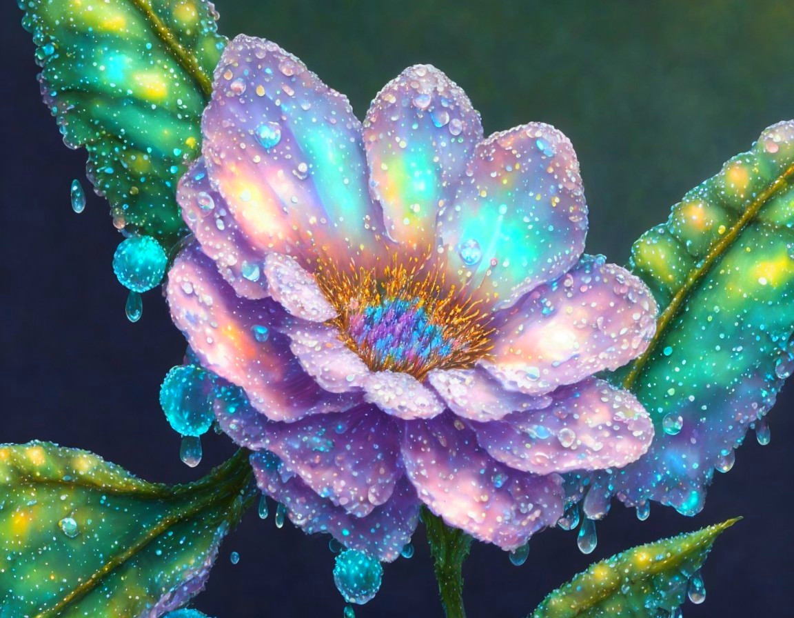 Colorful digital flower illustration with dewdrops in blue and pink hues.