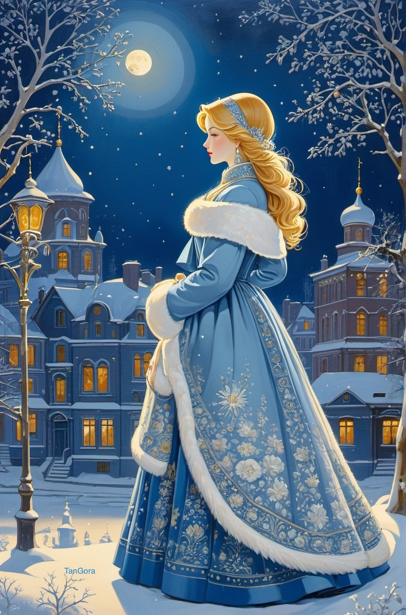 • Prompt: Winter. Snow. City. Woman.Gzhel.Zlatoust engraving.Night. Moon. Palekh. Russian patterns. Oil painting. Pitch. Fragments of amber.