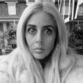 A portrait of a surreal, ethereal female figure with an extremely pale complexion and a serene, closed-eyed expression. Her face is soft and symmetrical with subtle blush on her cheeks, a small, closed mouth, and no visible eyelashes or eyebrows, presenting an otherworldly appearance. Her voluminous LONG hair is a masterpiece of intricate, swirling, and curling shapes, resembling white marble or sculpted alabaster, enveloping her face and cascading around her form. The hair flows like liquid with each strand exquisitely defined, creating an elaborate and ornate headdress that extends beyond the boundaries of a normal silhouette. The strong contrast between her light hair and the dark gray background emphasizes the surrealism of the image, giving the impression of a sculpted figure against a void. No clothing or other body features are depicted, keeping the focus purely on the face and the fantastical hairstyle. The overall feel of the image is one of calm, elegance, and otherworldly beauty.