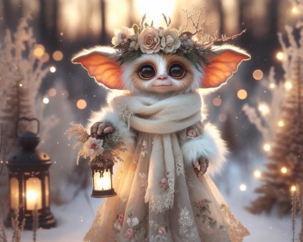 Prompt: Create an enchanting scene featuring a charming, anthropomorphic gremling character. The mouse has large, expressive ears and bright, curious eyes, with a warm beige skin tone. It wears a delicate, fluffy cream-colored dress adorned with floral details and a flowing scarf draped around its neck. The character stands in a wintry landscape, surrounded by softly lit snow-covered trees and gently glowing ambient lights. Its head is decorated with a crown of delicate flowers and tiny antler-like branches, enhancing its whimsical appearance. The mouse holds a lantern in one hand, casting a gentle light, while the other hand clutches a bouquet of floral accents. The background should have a dreamlike quality, softened by a warm glow and subtle sparkles in the air, creating an atmosphere of magic and wonder. The mouse also wears sparkling boots that add a touch of elegance to its charming outfit.
