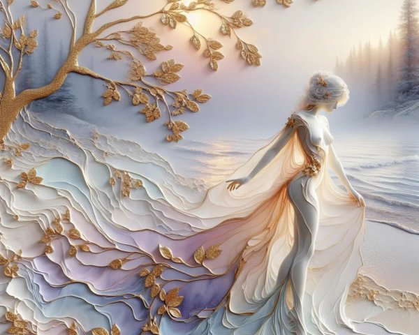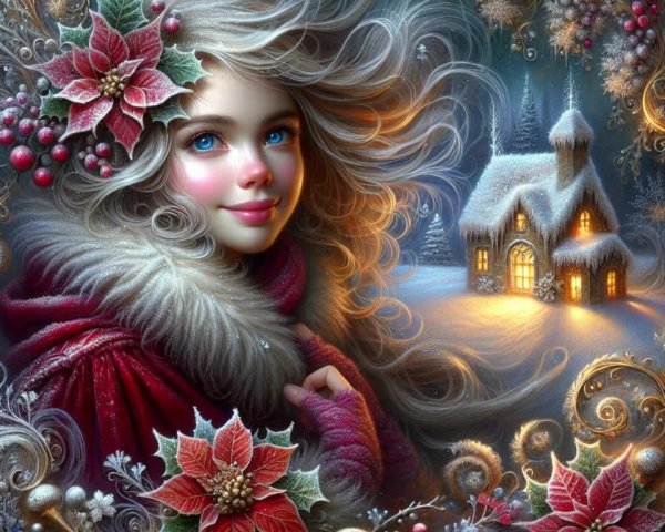 Prompt: Victorian Encaustic art, fluid textures. Enchanted. A happy girl, dark blue eyes, windblown blonde hair dusted with snow. Crimson velvet cloak trimmed in silver frost. Holly branches, poinsettias, and curling stems with shimmering golden filigree. A tiny round cottage grown from a frosted pinecone, windows glowing with amber light. Aesthetic, magical, radiant Yuletide atmosphere. UHD 4K.