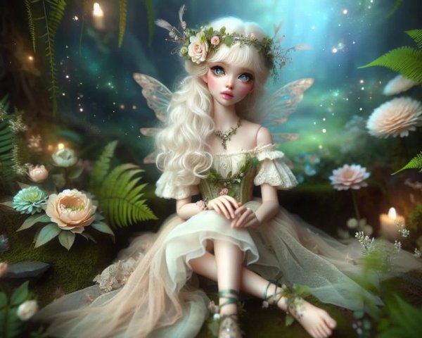 Prompt: Create an enchanting scene featuring a delicate fairy girl standing in a mystical forest. She has soft, pale skin with rosy cheeks and an innocent expression. Her short, platinum blonde hair frames her face and is adorned with a small floral headpiece. The fairy has large, expressive eyes that sparkle with wonder, enhancing her ethereal appearance. She wears a charming, off-shoulder dress made of soft, light fabrics in shades of ivory and pale green, accentuated with layers of feathers and floral details. Her slender, childlike body is poised gracefully, with arms gently outstretched. The scene is illuminated by soft, glowing orbs and surrounded by lush vegetation, including ferns and whimsical flowers that add a touch of magic. The background features a hazy, dreamy atmosphere with dappled light filtering through the leaves, creating a serene and enchanted ambiance. Her bare feet are lightly wrapped with delicate bands, keeping with the ethereal theme of the image. The overall composition is whimsical and enchanting, inviting a sense of wonder and fantasy.