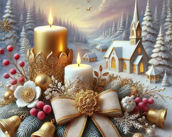 Prompt: Create a mesmerizing and ethereal scene featuring a beautifully lit candle at the center, surrounded by intricate swirls and vibrant cosmic elements. The candle is elegantly cylindrical with a delicate flame, emitting a warm glow. Its base is adorned with lush green pine branches and shiny golden ornaments, creating a festive atmosphere.
