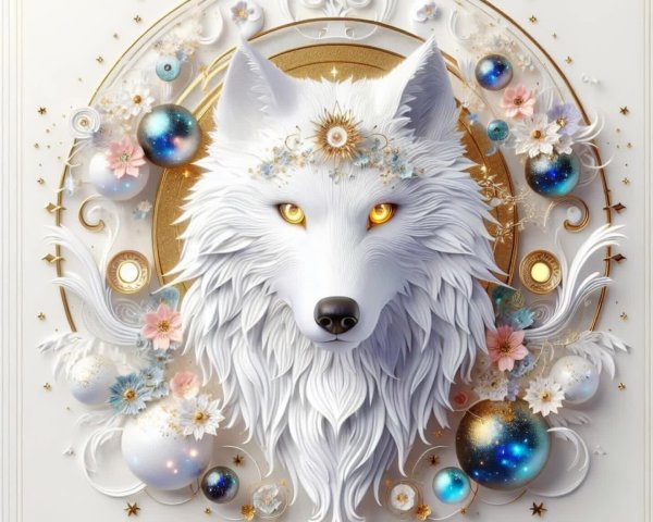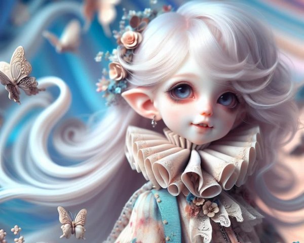 Prompt: A whimsical character with delicate features, long white hair, and a playful expression. She wears a ruffled collar adorned with flowers, set against a dreamy, swirling background with butterflies.
