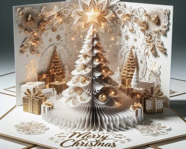Prompt: Centered A luxurious white pop-up Christmas card, opened to reveal intricate layered gold foiled decorative scenes: a magnificent Christmas tree with shimmering text "Merry Christmas"
