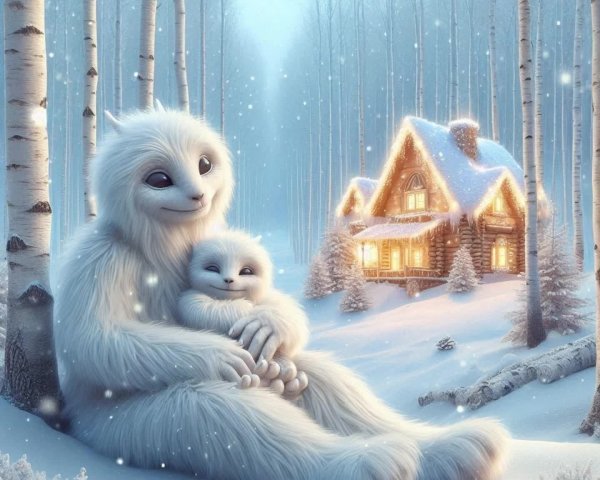 In the background, a cozy wooden cabin adorned with glowing windows is slightly obscured by falling snowflakes, creating a warm and inviting atmosphere amidst the chilly winter setting. The color palette should be a harmonious blend of soft whites, rich reds, and earthy browns, evoking a sense of peace and wonder in this magical winter landscape.