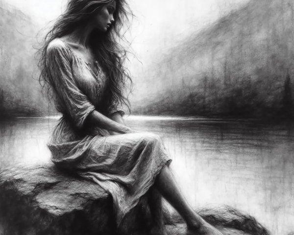 Prompt: A monochrome charcoal drawing of a thoughtful figure seated on a rugged rock by a still lake. The person’s long, wavy hair and loose clothing are rendered with expressive, textured strokes. The background features faint outlines of distant mountains and a hazy sky, with smudged shadows and soft highlights creating a moody, introspective atmosphere.