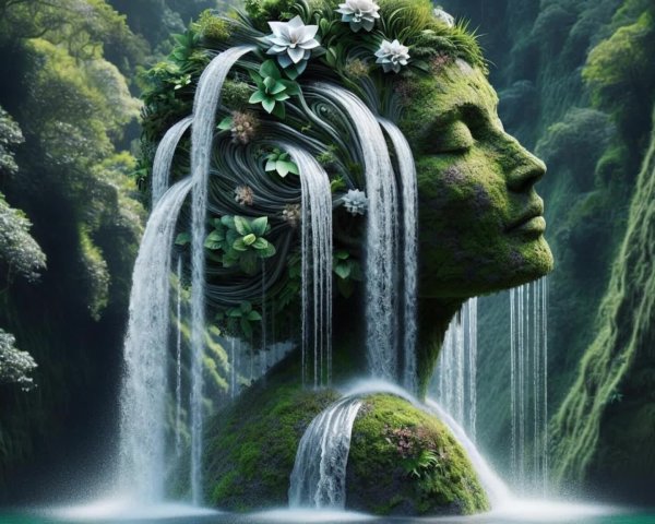 Prompt: A beautiful photorealistic of a woman, with water cascading down from her body, forming multiple graceful waterfalls that flow into the pool below. head and body are covered in moss and plants, and its hair is composed of small white flowers and green leaves. The minimalist sculpture blurs the lines of a lush mountain forest.