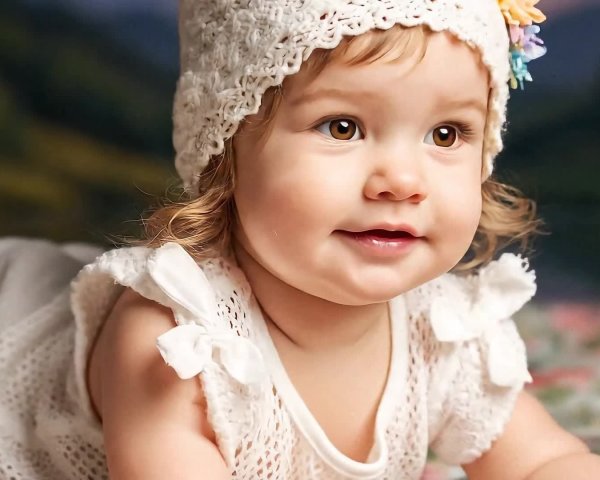 Prompt: A whimsical illustration of a young smiling girl lounging in a winter setting. She has long, braided white hair adorned with a decorative crown of silver leaves and snowflakes. Her oversized, pointed hat is covered in a snowy texture and features icicles. Dressed in a cozy white outfit, she rests her chin on her hands, gazing curiously. The scene is accented with delicate snowflakes and sparkling ornaments scattered around her, enhancing the enchanting winter atmosphere.