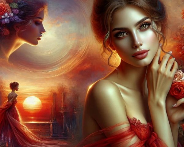 Prompt: Create an ethereal beach scene at twilight, featuring a serene figure of a woman on the shore, wearing flowing, translucent garments that billow gently in the breeze. The woman's silhouette is delicate and graceful, with long hair cascading down her back. She stands barefoot on soft, golden sand, facing the gentle waves of the ocean.