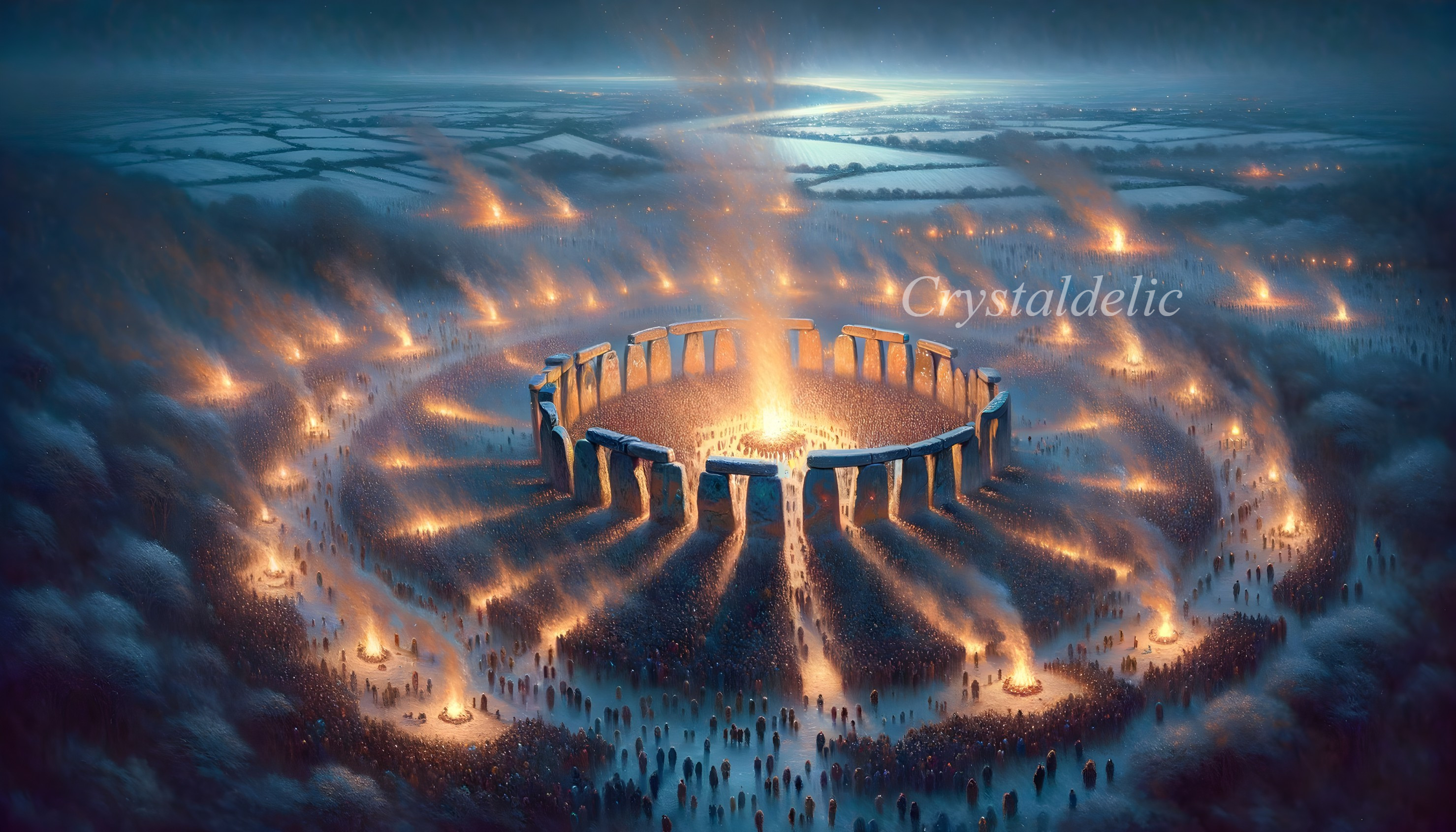 • Prompt: Oil painting. Aerial view. Winter solstice crowds gather at Stonehenge in celebration. Celebrated by cultures all over the world for thousands of years, the winter solstice is also known as Yule, a celebration of light and the symbolic rebirth of the sun. Massive fire in the circle. Worshiping. Magical, enchanting light. By Monge, Grimshaw and Yerka. Vibrant, vivid.