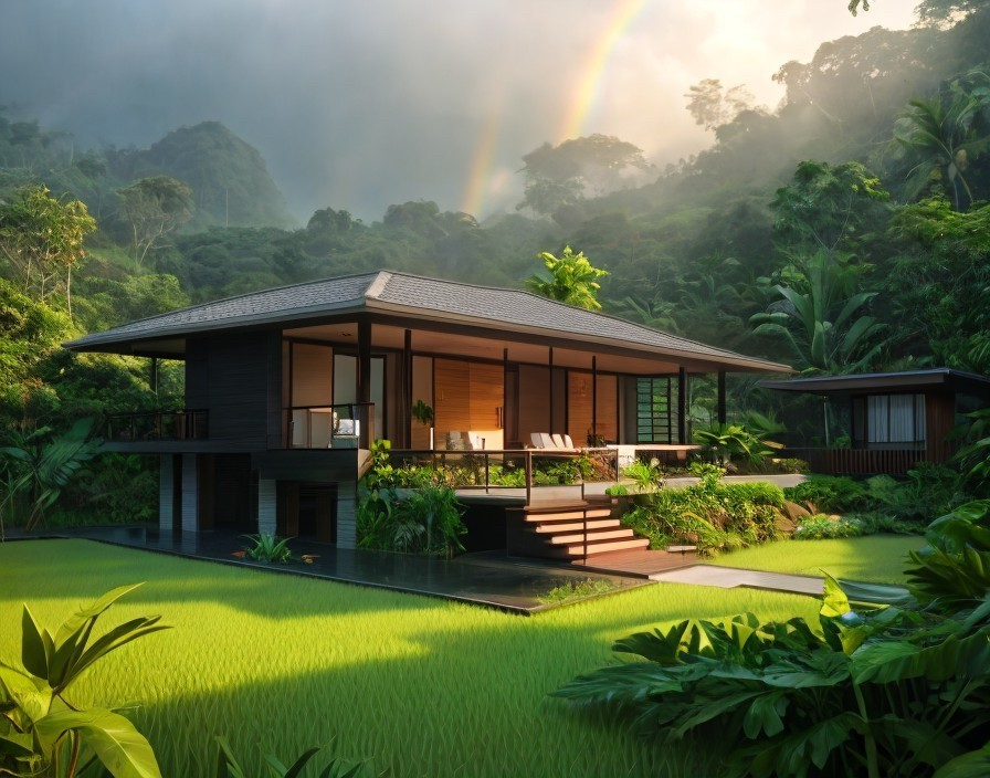 • Prompt: Small Modern Balinese style villa by the hill side of tropical rainforest over looking the paddy field. Drizzling rain and slight rainbow.