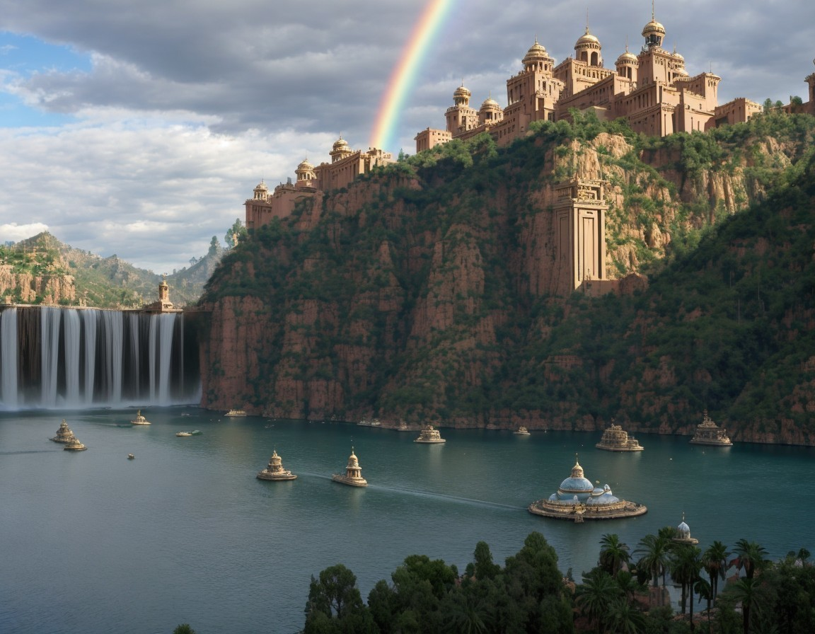 Cliff-top palace with waterfall, lake, and rainbow 90w