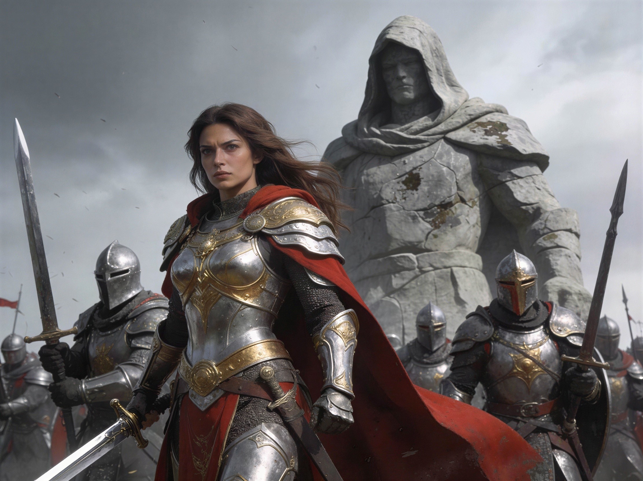 Prompt: A powerful female warrior stands at the forefront, clad in intricate silver armor, with a flowing red cape billowing behind her. Her expression is determined and fierce, with long, braided chestnut hair framing her strong features. Behind her, a trio of armored knights looms, each wearing imposing helmets and dark suits of armor. The background features a dimly lit stone castle interior, with shadows and light contrasting against the cold stone. The atmosphere is tense and heroic, evoking a sense of adventure and battle readiness.