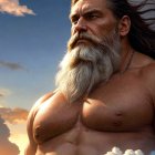 Prompt: A weary, sorrowful man in his mid-thirties, European descent, slim build, bare torso, with a rough animal pelt tied around his waist. Long unkempt chestnut hair, thick beard, piercing blue eyes. Not a warrior, not tribal, no tattoos, no weapon.