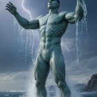 The sky is torn apart with storm clouds and lightning, mixing natural chaos with artificial brilliance. Cinematic, epic, hyper-detailed, realistic. Atmosphere of awe, terror, and the unstoppable return of forgotten power.