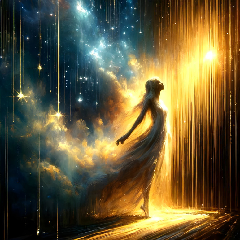 Ethereal Corridor with Shimmering Orbs and Cosmic Clouds