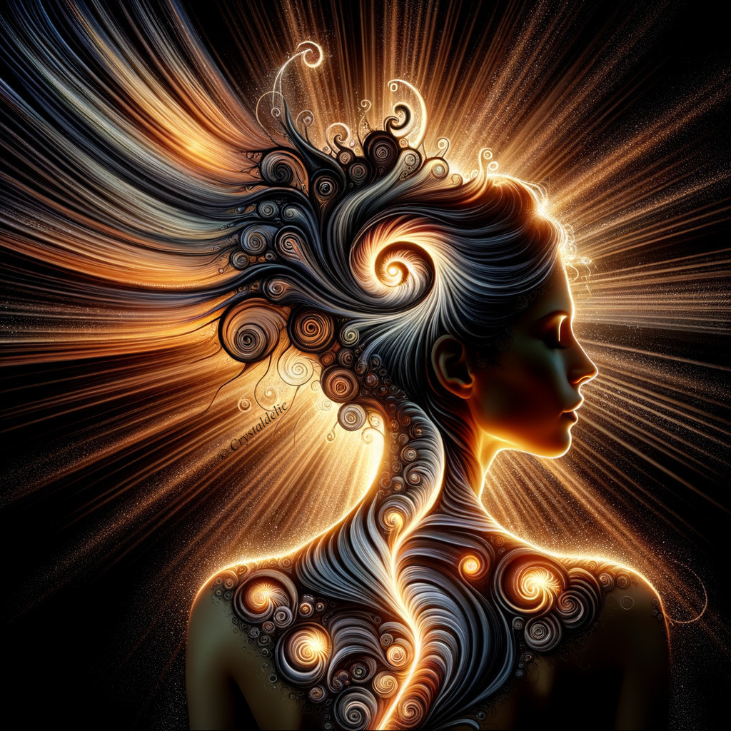 • Prompt: Within the depths of her gaze, behold the radiant souls dancing within. A luminous spiral of ink gracefully adorns her spine, she strides with an aura of goodness. Her essence resonates with the purest light, embodying the soul of the brighter side.