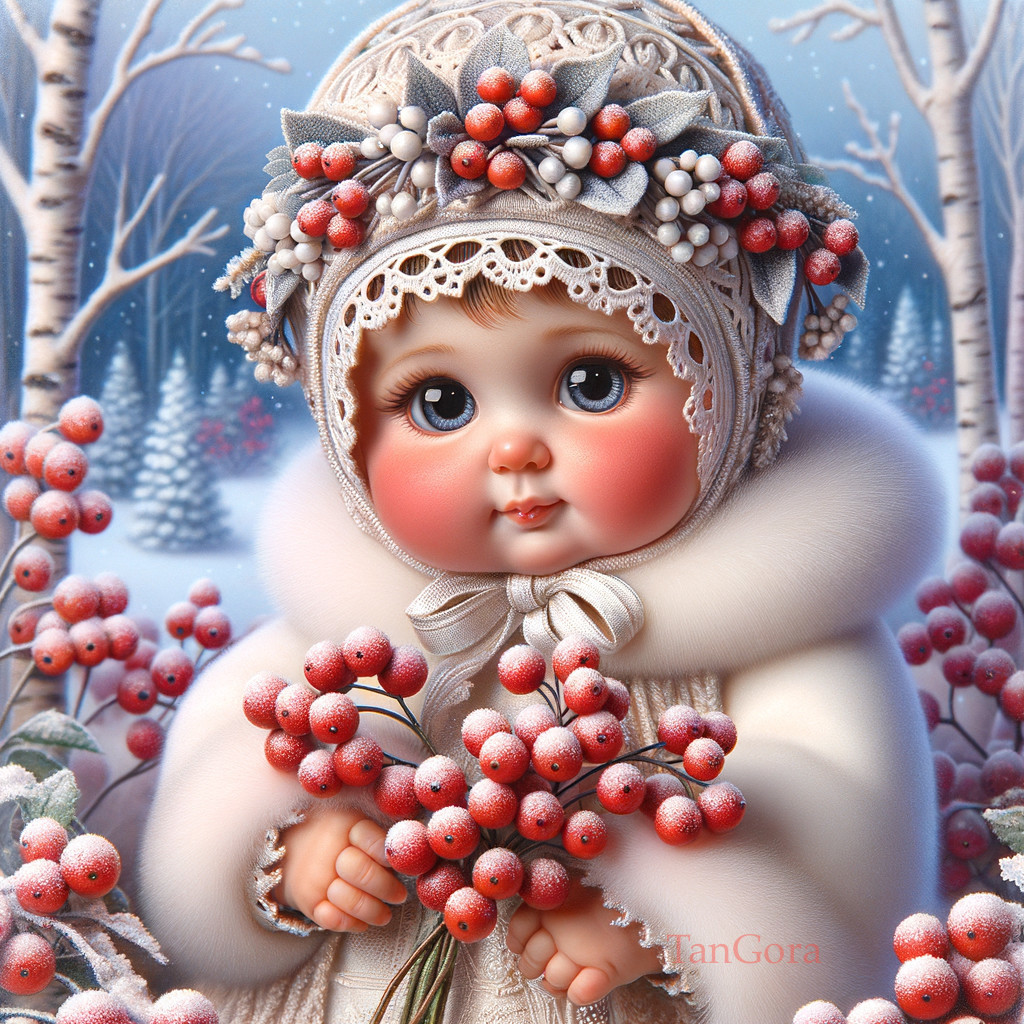 • Prompt: Winter.A beautiful baby with plump cheeks in a lace-trimmed cap and a white fur coat. She holds a bouquet of winter red berries in her hand.There is a beautiful snow-covered forest in the background.Very cute. The most beautiful painting in the world.She has been awarded awards.