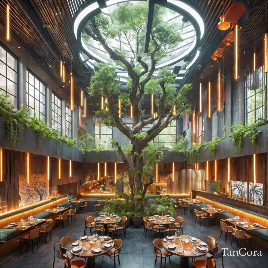 Modern Restaurant Featuring Tree Centerpiece and Skylight