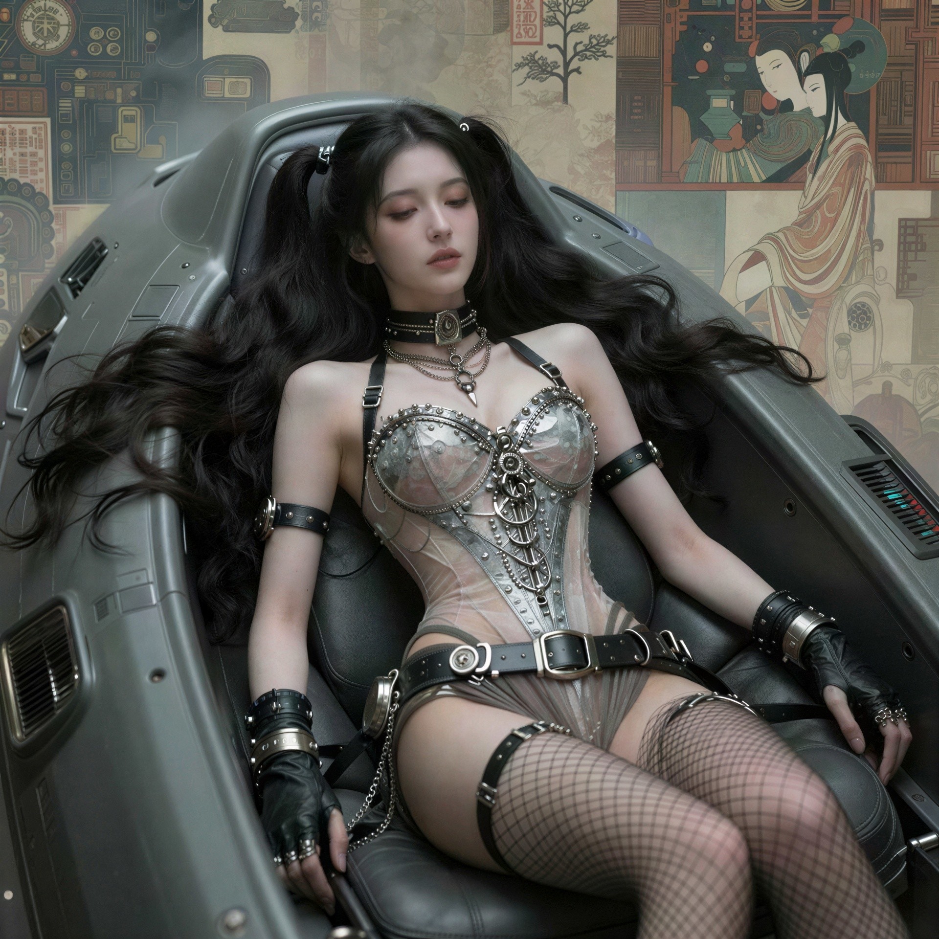 Prompt: (A masterpiece of unparalleled excellence), (This is a stunning full body view of portrait, created in the patchwork style of Hajime Sorayama), (A Young adult, Sexy woman, lying in a futuristic cockpit-like setting. Close-up full body view, high-angle view. Woman has long, dark hair styled in pigtails. Soft, neutral makeup. Expression is calm and serene. She wears a corset-style top with detailed silver embellishments, sheer overlay, and fishnet stockings. Black leather and metallic accessories are prominent, including a layered choker necklace, arm cuffs, and straps. The outfit evokes a futuristic, steampunk aesthetic. Interior setting is a gray-green, metallic spaceship-like environment, with control panel details visible. Light is muted, diffused, and creates a cool, mysterious atmosphere. The colors are muted and mostly subdued, with a focus on cool-toned neutrals and metallics. The lighting emphasizes the woman's features and accentuates the texture of her clothing. The composition is centered on the woman, with the environment acting as a backdrop. The overall mood is serene and slightly melancholic. Cyberpunk, steampunk, futuristic art style)). Full size image.