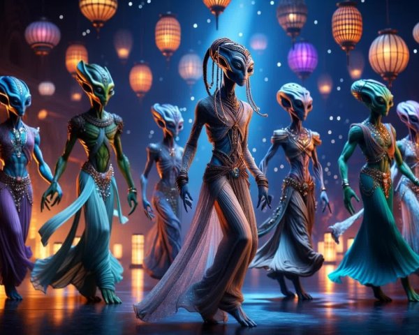 Prompt: An ethereal, clockwork automaton with the appearance of a beautiful 40 year old woman gracefully dances amidst a nebula of swirling stardust and cosmic dust. Its metallic gild foil dress is intricately detailed, reflecting the light of distant galaxies. The style is a fusion of steampunk aesthetics and cosmic horror, with a color palette dominated by deep purples and electric blue lace rendered with a painterly, dreamlike quality.