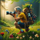 Prompt: Watercolor acrylic random pose a young white woman with curly, white, ruffled hair is holding a glass jar filled with glowing garlands. She is leaning towards the jar, looking thoughtful and serene. The background is dark and blurred, drawing attention to her and the softly illuminated jar. She is wearing a black top, which adds a sense of gloom to her appearance.