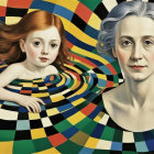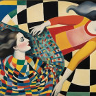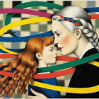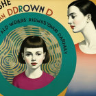 Prompt: Create a vibrant cityscape at dusk, featuring two large, stylized female figures that dominate the background. The figures are artistically rendered in shades of deep blue and black, with intricate patterns and swirls of color on their bodies, reflecting an ethereal quality. The figure on the left has a curled hairstyle, while the one on the right has flowing hair, both artistically exaggerated.