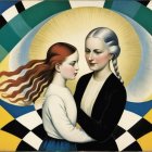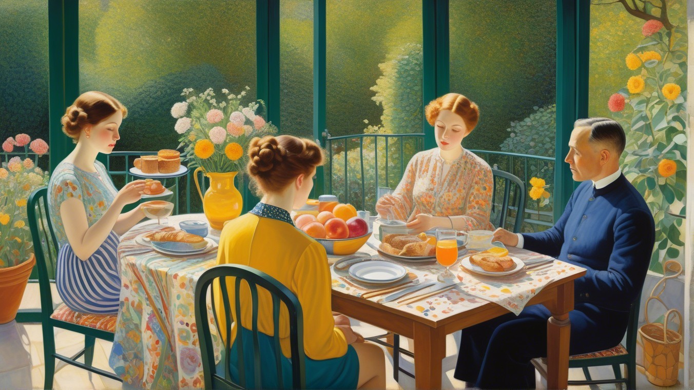 Prompt: Family eating brunch on the patio. Oil painting in the style of Gustav Klimt, Ravilious, Redon, Cressida Campbell, Sonia Delaunay, Aaron Douglas.