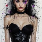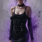 the slender teen has a pointy nose, bright blue-grey eyes, and she is wearing sneakers, a sleeveless dark lacy top inspired by victorian fashion and a dark skirt over ragged thighs and high-heeled sneakers, she wears dark make up over her pale white skin